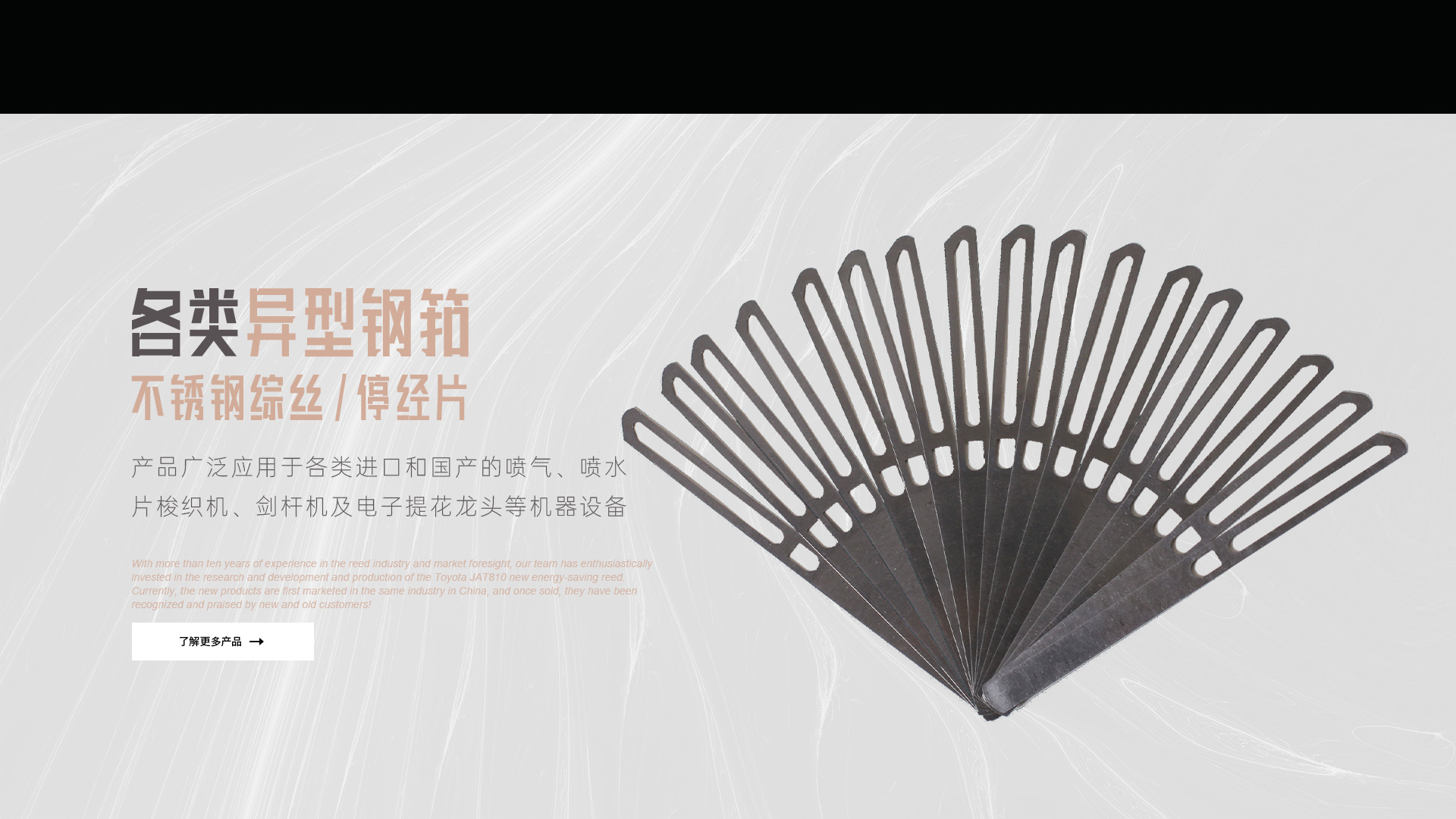 憑借十多年鋼筘行業(yè)經(jīng)驗及對市場的前瞻性,我們團(tuán)隊滿懷熱情的投入到豐田JAT810新型節(jié)能鋼筘的研發(fā)和生產(chǎn)當(dāng)中,目前新產(chǎn)品在國內(nèi)同行業(yè)中先行上市銷售,一經(jīng)銷售就得到了新老客戶的認(rèn)可和好評!